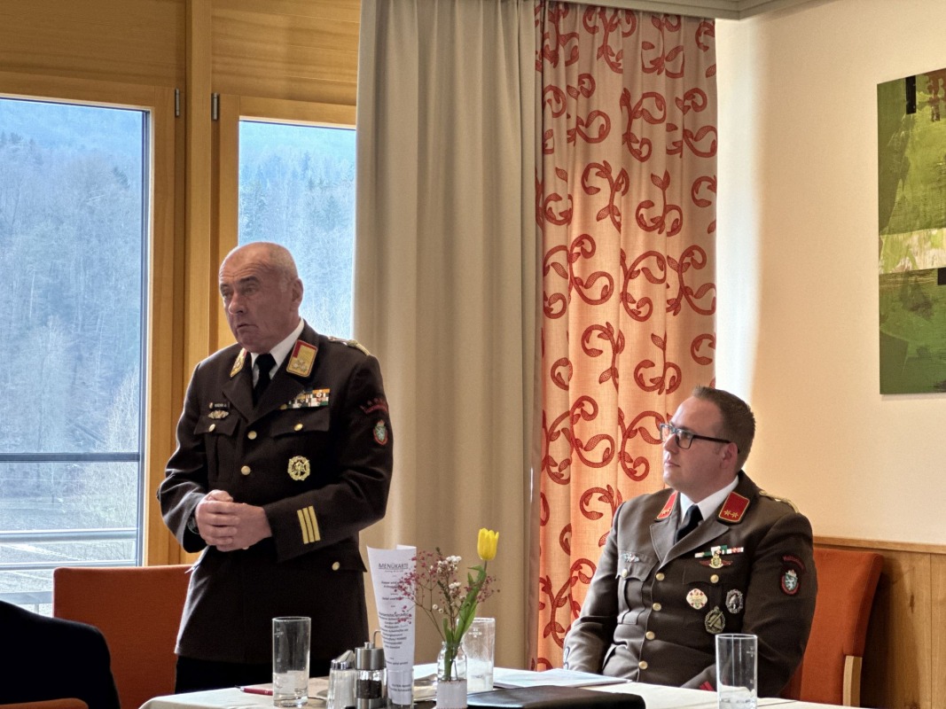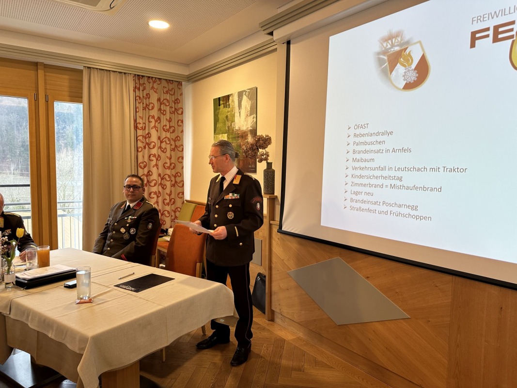 ABI DI (FH) Friedrich Legat konnte dazu zahlreiche Kameradinnen und Kameraden sowie eine Reihe von Ehrengästen begrüßen. Unter den Ehrengästen befanden sich Landesfeuerwehrrat Josef Krenn, Ehrenabschnittsbrandinspektor Johann Hammer, Oberbrandinspektor der FF Arnfels Andreas Lanzl, Abteilungsinspektor Georg Pucher von der Polizeiinspektion Leutschach, sowie Bürgermeister Erich Plasch aus Leutschach und Bürgermeister Karl Habisch von der Gemeinde Arnfels.