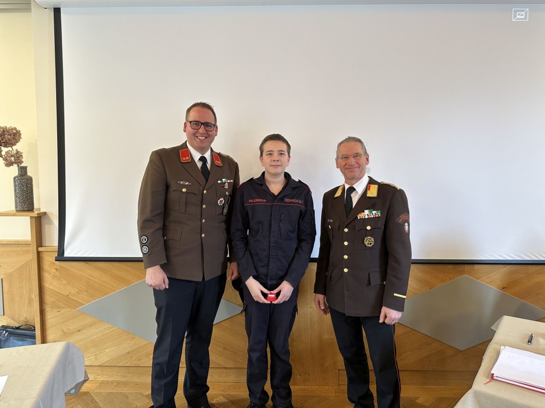 Für ihre erfolgreich abgelegten Abzeichen im vergangenen Jahr wurden JFM Emelie Gallunder und JFM Katrin Schmied mit den entsprechenden Dienstgraden ausgezeichnet. Eine besondere Beförderung erhielt JFM Nico Hernach, der zum Gruppenkommandanten der Feuerwehrjugend ernannt wurde.